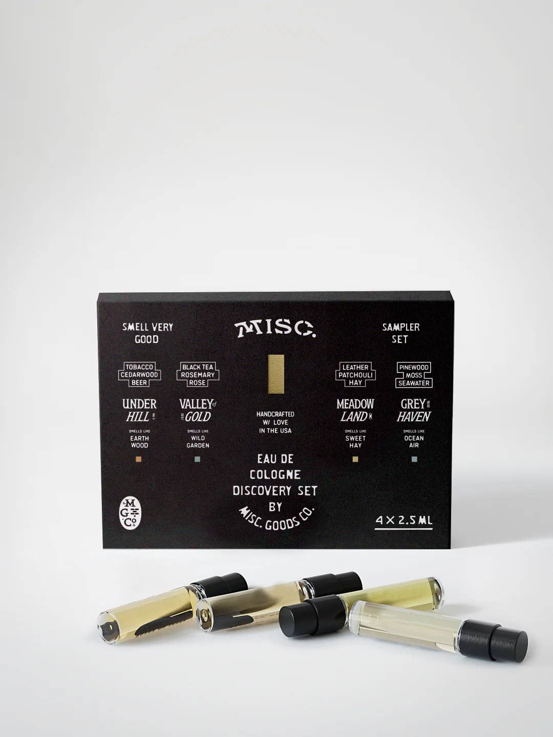 A scent journey through nature in four vials. Our Smell Good Discovery Set features six of our signature colognes — Underhill, Valley of Gold, Meadowland, Greyhaven, Nameless Earth and Kings Market — each inspired by a distinct natural landscape. Earthy, subtle, and long-lasting, these plant-based fragrances are designed to wear close and feel personal. Perfect for travel or gifting, this sample set gives you a way to explore our collection before choosing a full-size bottle. Calm, grounding, and thoughtfully crafted.