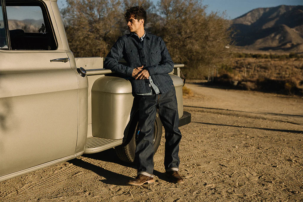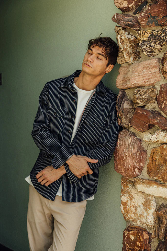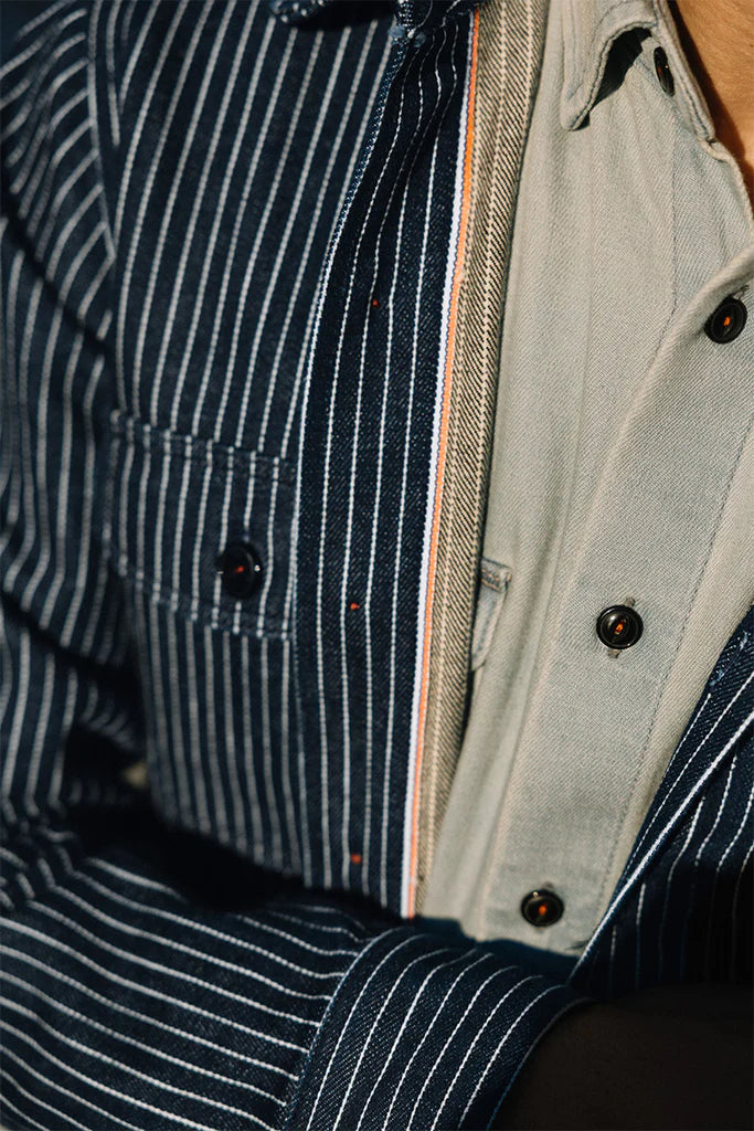 Fitted 3D panel shirt jacket. 14oz Striped 4-WAY STRETCH SELVEDGE™, chest and side pockets, pen holder, cat eye buttons, lined collar and cuffs. Made in USA.